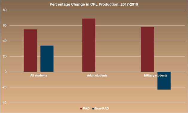 The nine PAD institutions reported they had adopted more methods of awarding CPL, marketed it more aggressively, and, most importantly, awarded more CPL to students. From 2017 to 2019, the PAD institutions saw an increase in CPL issued for adult learners of 69 percent. Among military students, there was a 58 percent increase in CPL.
