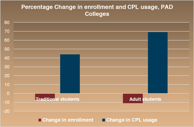 It is certainly evidence that the PAD colleges successfully targeted the intended population of adult students. Although adult learner enrollment declines outpaced reductions in traditional students (11 percent vs. 7 percent), CPL growth was most robust among adult learners.