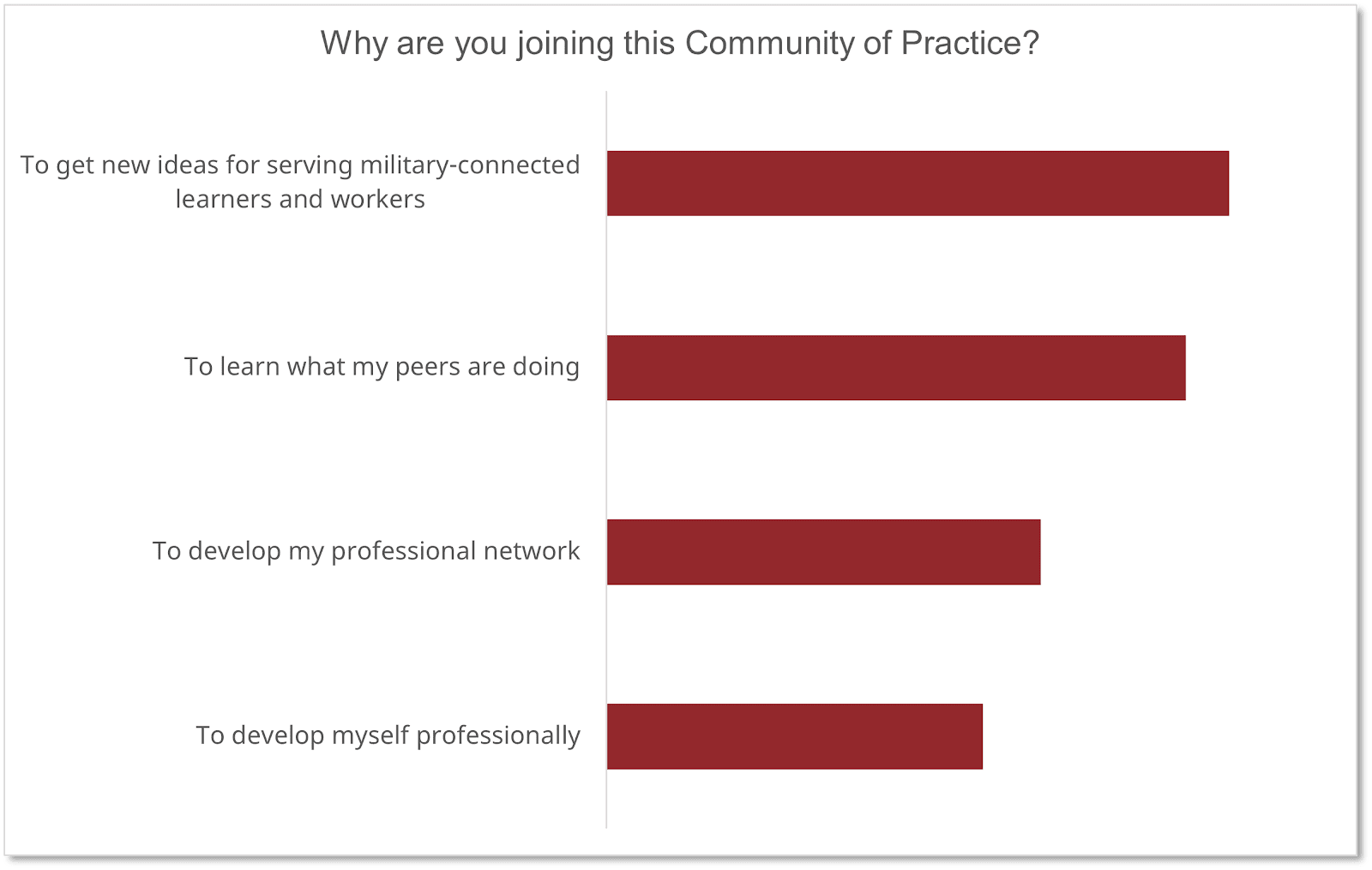 Delivered to community members in the first quarter of this year, the needs assessment explored motivations for joining the community of practice, collected data on the number of military-connected individuals group members serve and how they meet their needs, and identified strengths and challenges. It also highlighted priorities and goals and established annual benchmarking and trends.