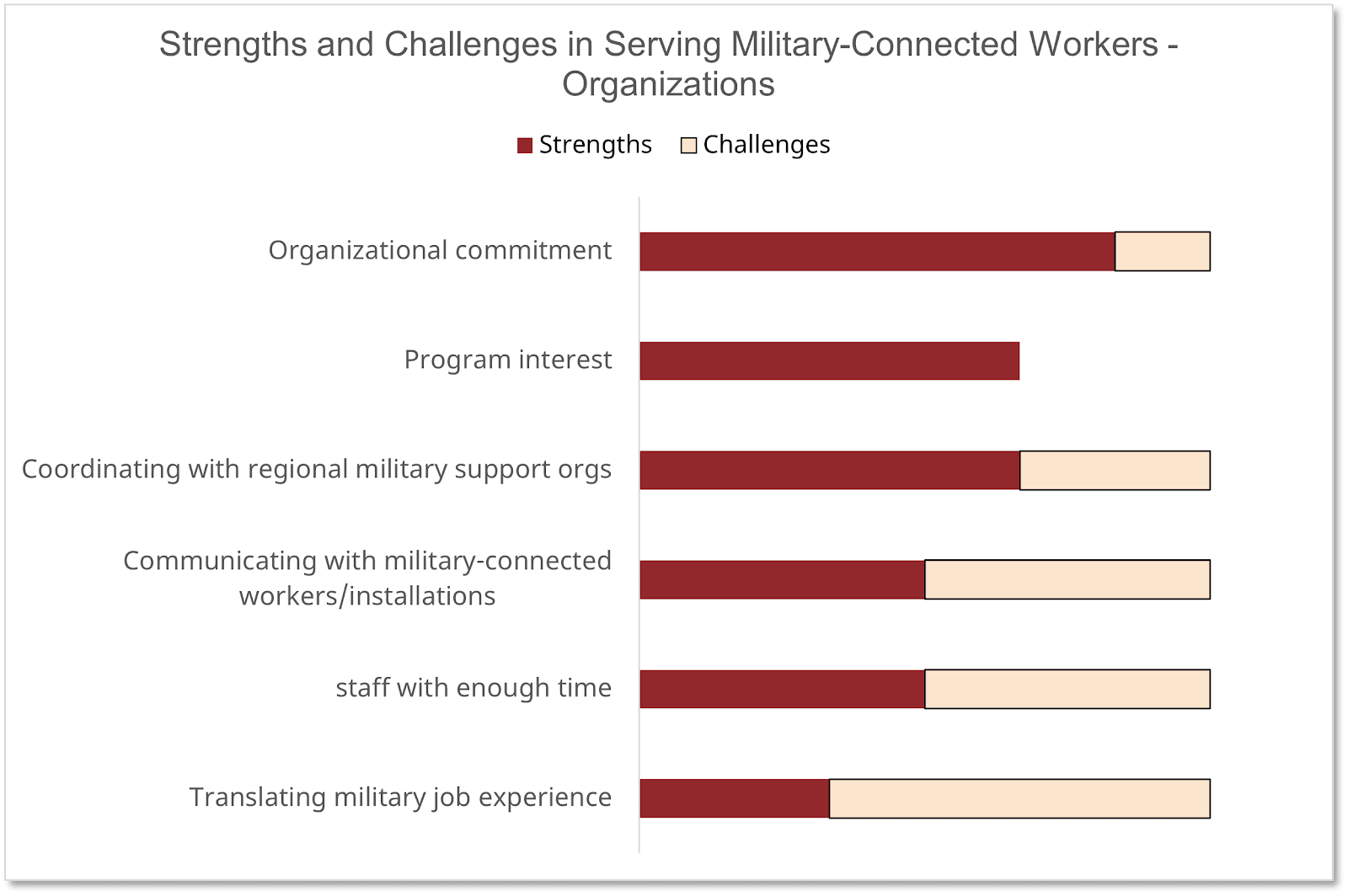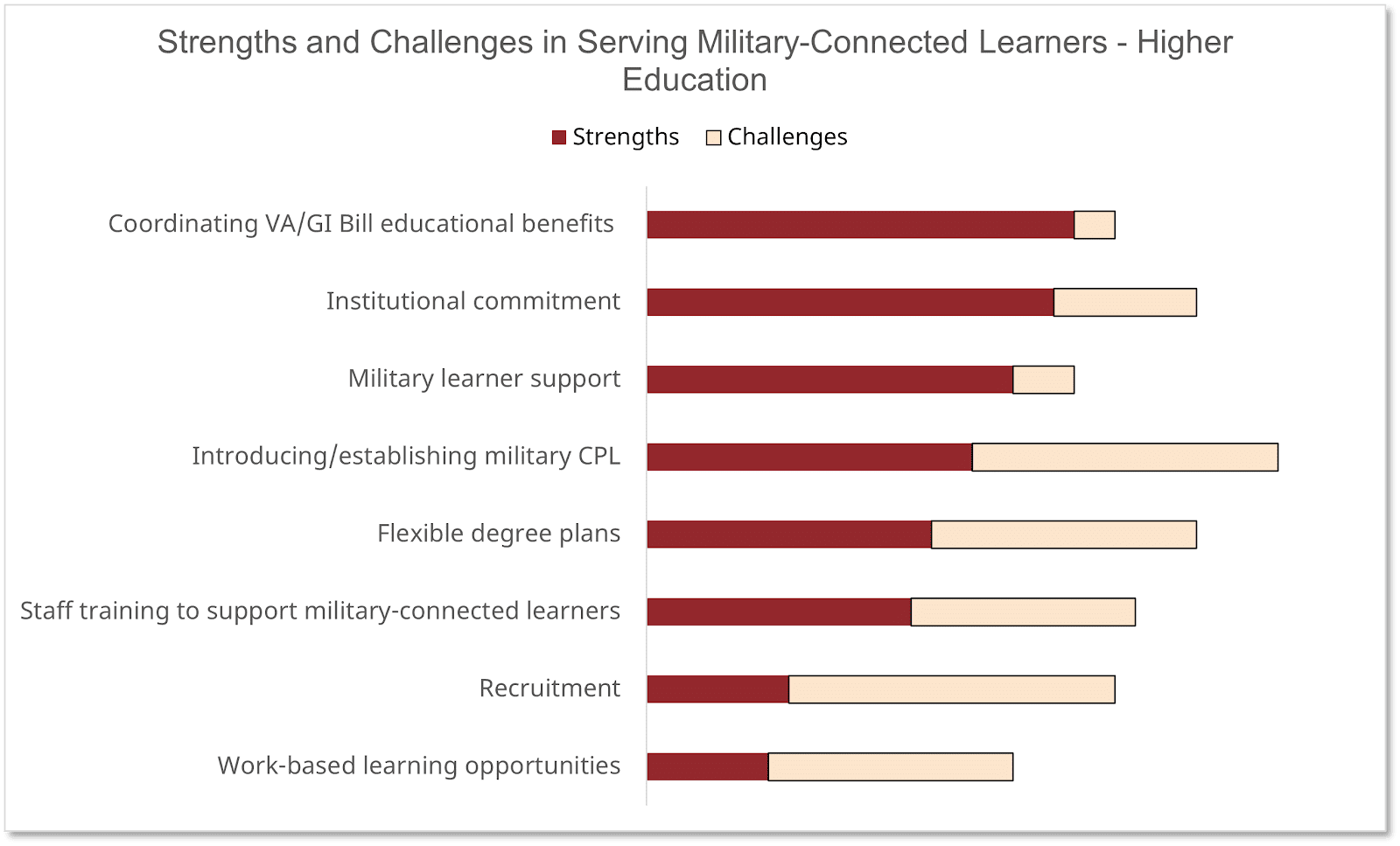 Findings highlighted opportunities for collaboration. For example, a strength among higher ed members is military CPL, while a challenge reported by respondents from military-serving organizations is "translating military job experience and training into civilian 'job language.'"